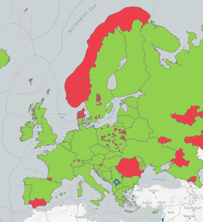 Figuur 2. NCD-uitbraken in Europa in de periode van 2020 tot (deels) 2025. In de figuur staan uitbraken weergeven die gemeld zijn middels WAHIS. Rood geeft de gebieden aan waar uitbraken hebben plaatsgevonden. Groen geeft de afwezigheid van uitbraken weer. Van de blauwe gebieden is geen informatie aanwezig en van de witte gebieden zijn geen uitbraken gemeld of er is geen informatie over beschikbaar in de bekeken periode ) (Bron: WAHIS) Let op: niet alle uitbraken staan vermeld op dit plaatje.