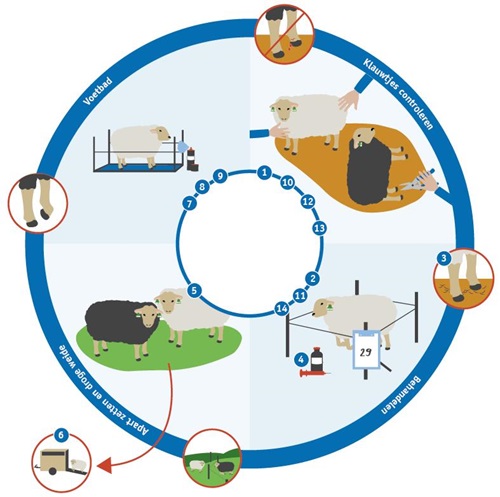 - Controleer na drie weken alle dieren, besnijd ze, selecteer aangedane dieren uit, pas voetbad toe en plaats ze in schone weide. controleer na drie weken alle dieren en besnijd ze zonodig; ruim de dieren die op dat moment nog afwijkingen hebben en verkoop de overtollige slachtrijpe dieren; doe de dieren na besnijden door een voetbad en verweid ze naar percelen waar minimaal twee weken geen schapen hebben gelopen.