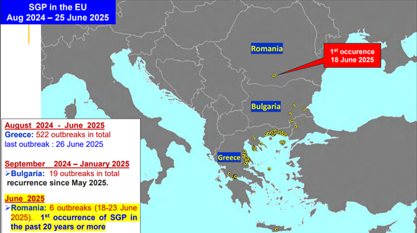 In 2025 zijn er uitbraken van SGP gemeld in Griekenland, Bulgarije, Servië en Roemenië. In 2024 in Griekenland en Bulgarije. In 2023 was dat in Griekenland, Bulgarije, Israël en Spanje. In september 2022 dook de ziekte opnieuw op in Spanje, dat er sinds 1968 vrij van was, en veroorzaakte een totaal van dertig uitbraken tot 17 mei 2023, toen de laatste uitbraak van de ziekte werd gemeld. De uitgevoerde bestrijdings- en uitroeiingsmaatregelen waren die welke zijn vastgelegd in de EU-wetgeving, gebaseerd op het volledig uitroeien van positieve kuddes, zonering (besmette- en toezichtzones van 3 en 10 kilometer) en beperking van verplaatsingen, en versterking van bioveiligheid en passief toezicht. Aanvullende informatie van de NVWA uit het Animal Disease Information System geeft inzicht in het feit dat er tussen 14 en 26 september op acht bedrijven uitbraken van schapen- en geitenpokken zijn bevestigd door middel van PCR-diagnostiek. De getroffen bedrijven variëren sterk in omvang. Het grootste bedrijf telde ruim 7500 schapen. Op drie bedrijven waren ook geiten aanwezig, waarvan één bedrijf met 20 dieren het grootste aantal bezat. De ziekte is alleen bij schapen aangetoond. Er is destijds uit een inventarisatie door de NVWA gebleken dat er toen geen recent transport van levende dieren en risicovolle producten vanuit de regio naar Nederland heeft plaatsgevonden.