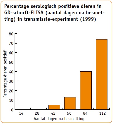 In een GD-proef (1999) was op dag 42 na besmetting 5 procent van de dieren serologisch positief. Na ruim drie maanden reageerde 74 procent van de dieren positief in de schurft-ELISA, zie grafiek.
