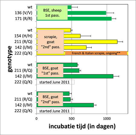 Intracerebrale besmettingen met runder BSE uit NL en geitenscrapie uit FR in geiten met verschillende allelen (allen heterozygoot waarbij het wildtype een van de allelen vormt, behalve de homozygote 154H/H dieren). De incubatietijden in geiten worden vergeleken met vergelijkbare BSE-besmettingen in schapen volgens Houston et al. 2003 (Prion diseases: BSE in sheep bred for resistance to infection. Nature 423, 498). Drie tot vijf geiten per testgroep. Bij “2nd pass.” werd BSE uit experimenteel besmette geiten doorgeënt in andere geiten, de meest effectieve manier en het meest krachtige entmateriaal om resistentie te testen.