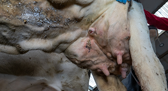 vaak kapotte plekken te hebben op de uier. Het verschilde per koe hoe erg het was. Bij de ene was de huid alleen wat geïrriteerd, de andere had een stuk van de huid kapot. Soms was er ook sprake van afgestorven weefsel. Er waren ook koeien met een ogenschijnlijk klein wondje aan de uier, maar als je deze dan schoonmaakte, dan bleek de infectie meer van binnen te zitten.”