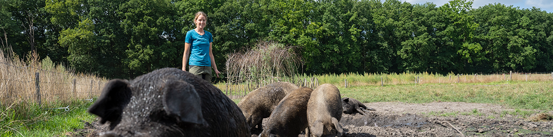 Rianne Joolink besloot in 2021 het roer om te gooien en een biologische landbouwopleiding te volgen. Ze kwam daarna terecht bij Herenboerderij de Groote Modderkolk in Loenen, waar ze sinds 2022 als professionele veehouder werkt. Samen met een collega-boer runt ze de coöperatieve boerderij. Rianne is verantwoordelijk voor het vee, waaronder de varkens. “Met de vorige koppel biggen hadden we problemen. De koppel van dit jaar doet het erg goed.”